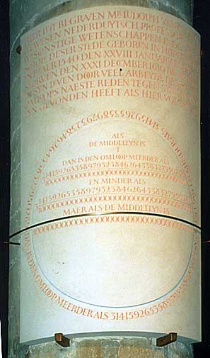 You may remember than Ludolph Van Ceulen spent many years in calculation, and by the time he died in 1610 he had found 35 decimal digits of pi. Those digits were engraved on his headstone, which unfortunately has been lost. On July 5, 2000, a special service was held in the city of Leiden, the Netherlands, commemorating Ludolph Van Ceulen and his devotion. Maarten Willems was on hand, and wrote: "The event was very well organised and there was a surprisingly great interest, both in audience (an estimated 400 people in the afternoon; about 750 people that night) and in the press. There even was an item on pi on national television!"